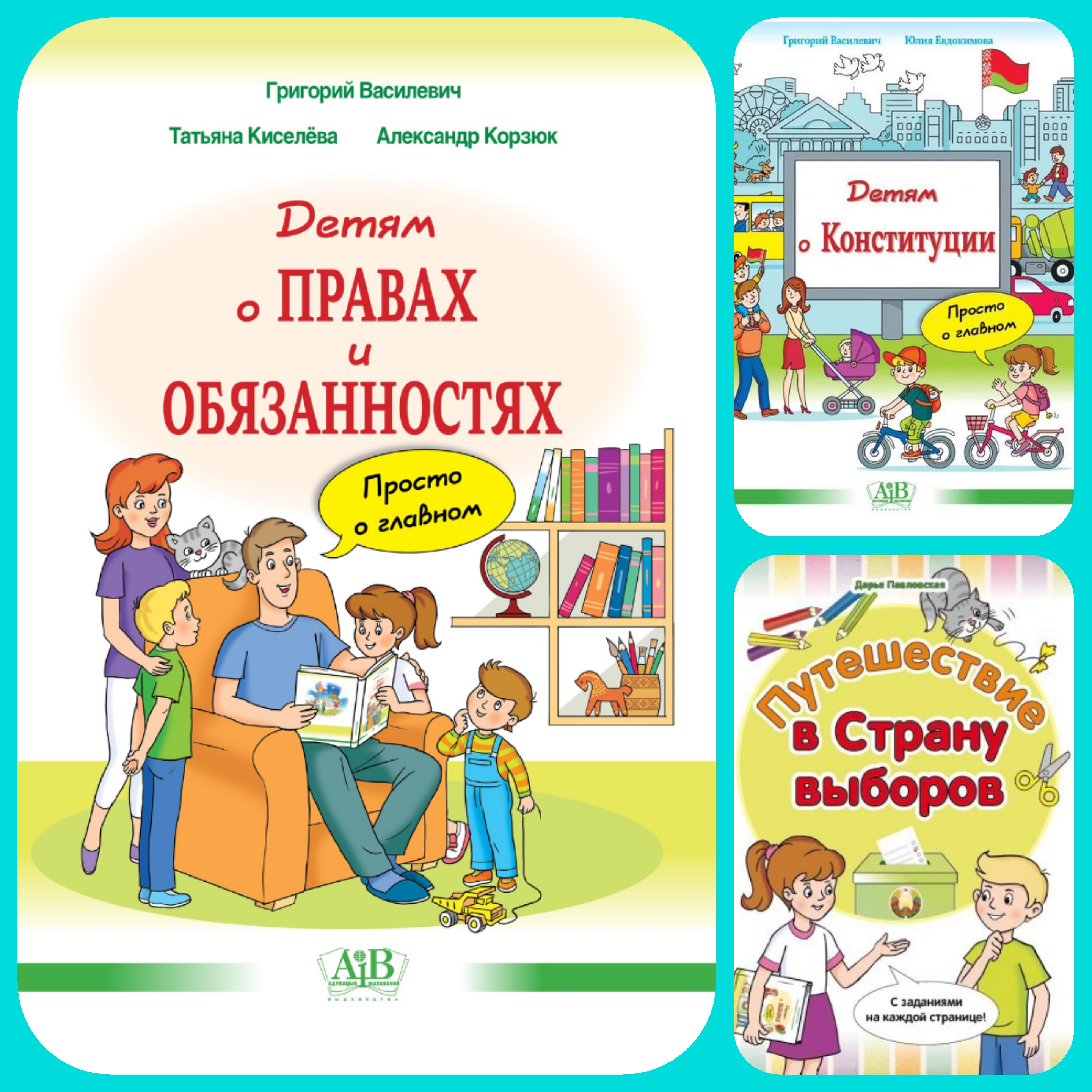 Григорий Василевич, Юлия Евдокимова «Детям о Конституции: просто о главном». Каждый гражданин нашей страны должен уважать и соблюдать ее законы, а еще знать свои права. В данном издании простыми словами объясняются права и обязанности гражданина, приведены интересные факты из истории становления нашего государства. Аналогии из жизни подскажут, как пользоваться своими правами и ответственно подходить к обязанностям, возложенным на каждого гражданина Республики Беларусь.